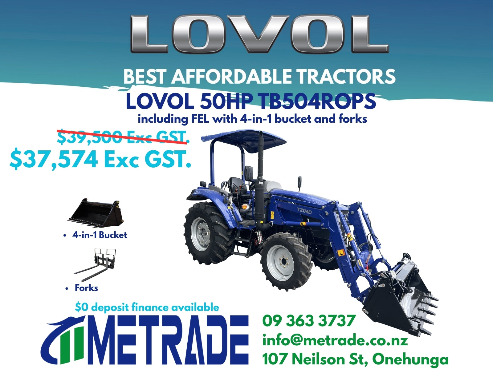 All prices are quoted in New Zealand Dollars and exclude a 15% Goods and Services Tax (GST). All prices displayed and products and services offered to be supplied on www.metrade.co.nz are subject to change without notice. All items are subject to availability. All tractor prices quoted are for the tractor itself unless otherwise stated. The image shown may show implements and different colours of the product for sale. All implements are additional costs to Tractors unless stated otherwise.